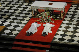 Durante la ceremonia, los dos jóvenes hicieron sus promesas y se postraron durante la proclamación de las letanías de los santos. El Sr. Obispo y los demás presbíteros procedieron a la imposición de las manos como signo de transmisión del Espíritu Santo. Tras revestirse con la estola y la casulla, se les hizo la unción de las manos y se les entregó el cáliz y la patena. Finalmente, el prelado y los sacerdotes abrazaron a los dos nuevo presbíteros.